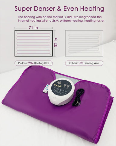PINJAZE far-infrared sauna blanket has a patented circular control box, which is small and beautiful. The bottom area is increased, and the heat dissipation is fast. There are indication signs on the control panel for easy operation. Use Oxford cloth material inside and outside, non-melting, harmless, eco-friendly, waterproof and easy to clean.