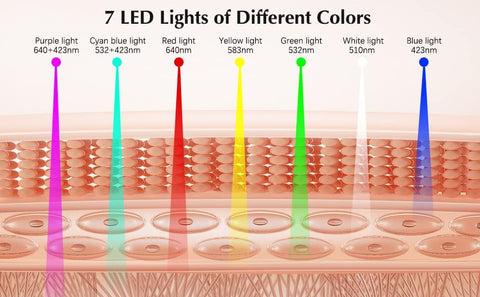 - [the Seven in one color LED facial mask] Seven different color light sources have different effects: red light - promoting blood circulation. Green light - reduces scars. Yellow light - improves skin redness. Blue light - soothes allergic skin. Orange light - promotes metabolism. Purple light - white highlights. CA2+(White Light) - Improves wrinkes and sagging skin.